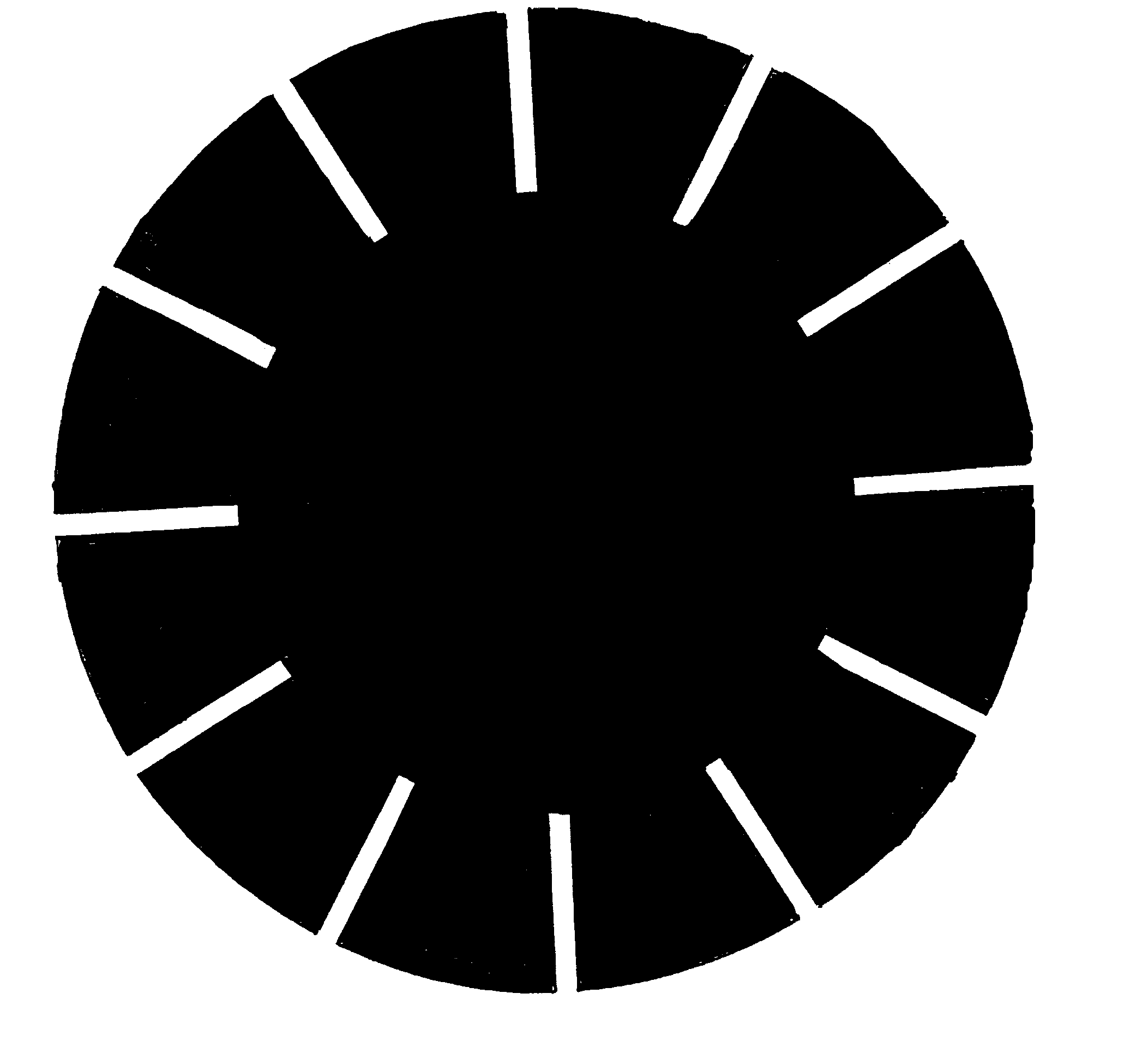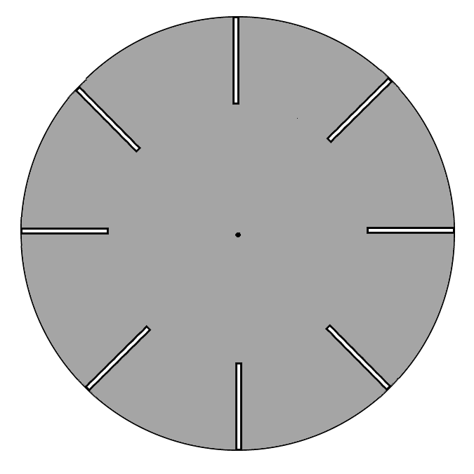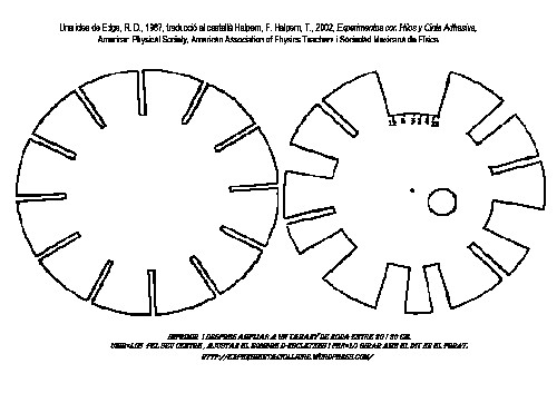 Malgrat els enllaços de dalt a plantilles per construir estroboscopis o l’alternativa de dibuixar-los un mateix amb les escletxes desitjades, he trobat un disseny molt interessant a un magnífic llibre de Edge, R. D., 1987, traducció al castellà de Halpern, F. Halpern, T., 2002, Experimentos con Hilos y Cinta Adhesiva, de l’American Physical Society, American Association of Physics Teachers i la Sociedad Mexicana de Física,  que permet construir un disc estroboscòpic amb un nombre de ranures variable entre 2 i 12 i que m’he permès el redibuixar-lo esperant que ningú s’enfadi i que sigui d’utilitat en les classes de física.