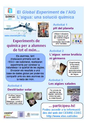 Sota aquest títol estan englobades les activitats proposades per la Comissió Internacional de l’AIQ que promou la participació d’alumnes de tot el món en la realització d’activitats experimentals que posen en relleu el paper de la química en relació amb la qualitat de l’aigua i els tractaments de depuració i de potabilització.