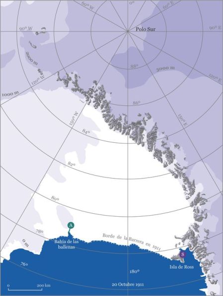 Amundsen ja va partir el dia 19 i de Scott encara no hi ha noticia que hagi iniciat el camí. Al costat teniu el mapa de la zona, on està marcat el camí que ja ha fet Amundsen a dia d’avui des de la Baia de les balenes.