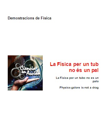 Vaig participar amb una sèrie d’experiències que tenien per fil conductor el fet d’estar realitzades amb tubs i pals. D’aquí, el títol que vaig donar a les demostracions va ser: La Física per un tub no és un pal.