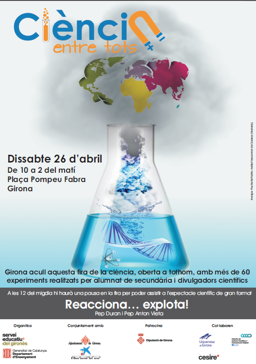 Aquest proper dissabte 26 d’abril de 2014, Girona s’afegeix a les ciutats que organitzen una fira de ciència al carrer amb la participació activa de l’alumnat i professorat dels centres del territori. La iniciativa ha sorgit del Centre de recursos pedagògics del Gironès impulsada pel professor Tavi Caselles, del que recomano la pàgina web de Física i el bloc d’experiments que edita.