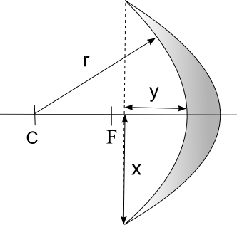 Per a calcular la distància focal dels miralls còncaus no cal més que allunyar-se fins que et vegis la cara borrosa, tot just entre veure’t la cara dreta i invertida, i mesurar en aquest moment la distància entre el mirall i el teu nas. També es pot fer d’altres maneres, com per exemple, mesurant les dimensions del mirall i utilitzant càlculs geomètrics: es mesura x (el radi del mirall) i y (la profunditat del mirall) i es calcula el radi de curvatura amb la següent equació: