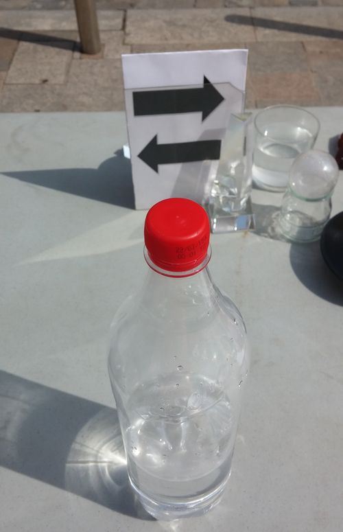 Omplim completament una ampolla d’aigua i observem els objectes al seu través. Quan l’ampolla està vertical els objectes que veiem han invertit les seves parts esquerra i dreta, encara que les parts superior i inferior segueixen al seu lloc. En canvi, quan l’ampolla està horitzontal són les parts superior i inferior dels objectes les que apareixen invertides, però no l’esquerra i la dreta. És el que s’observa en les fotografies de sota.