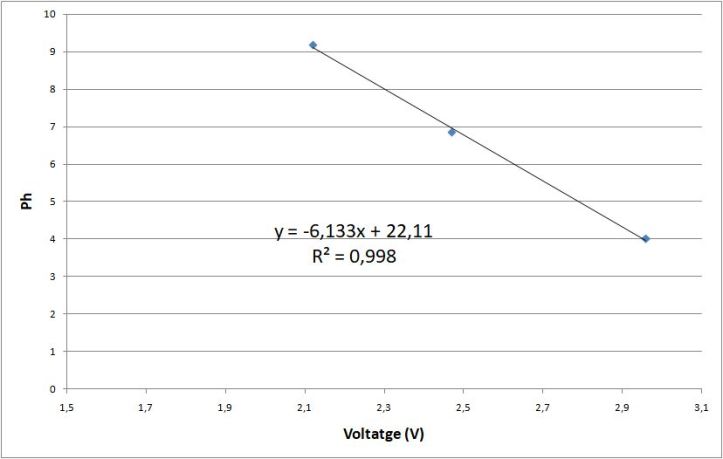 Utilitzant els sobres amb pH 4,01, pH 6,86 i pH 9,18 he obtingut els voltatges 2,96, 2,47 i 2,12 respectivament. El sensor és lineal per la qual cosa la fórmula per calcular el pH és y = mx + b, que es pot obtenir de l’equació de la línia de tendència al representar gràficament els valors en un full de càlcul.