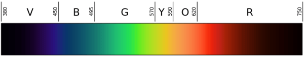 Dibuix de l’espectre de la llum visible amb referències de la longitud d’ona i de les franges de color