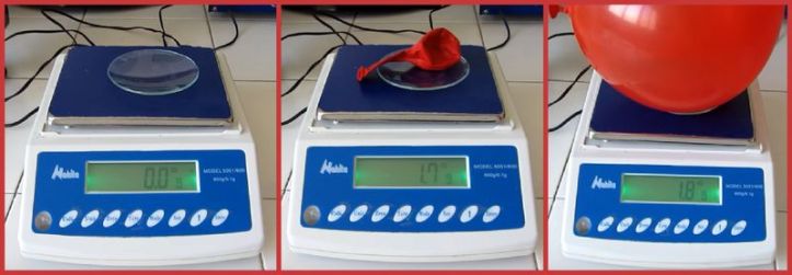 En omplir el globus d’aire comprova que ha augmentat el seu pes en 0,1 g!!, i conclou que l’aire pesa. Acaba el vídeo donant una explicació, de la que millor oblidar-se, en la que confon la causa del pes dels gasos amb la propietat dels gasos de fer pressió sobre les parets del globus,.
