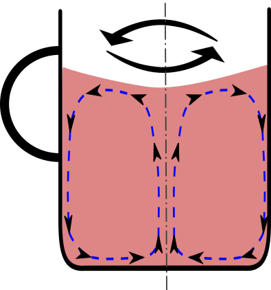Com que la massa s’ha de conservar, l’aigua que es mou cap al centre de la tassa després gira cap amunt i cap a la superfície, i posteriorment gira cap a la paret lateral de la tassa i finalment torna a la part inferior, reomplint l’aigua que originalment hi havia al fons. Dibuix derivat de Tea_leaf_Paradox_Illustration.svg