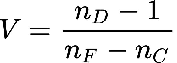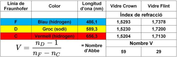On V és el nombre d’Abbe, també denominat nombre V. Se tracta d’un nombre adimensional ja que els índexs de refracció també ho són. nD, nF i nC són els índexs de refracció del material a les freqüències del groc (Na), blau (Hβ) i vermell (Hα) de longituds d’ona 589,2 nm, 486,1 nm i 656,3 nm, respectivament, que tradicionalment eren fàcils d’aconseguir. No sempre s’utilitzen aquestes longituds d’ona però són les més habituals. Recordo que el groc es troba en l’espectre visible entre el blau i el vermell, situats als extrems.