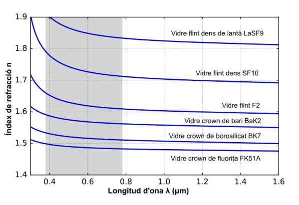 Aquí sota es mostra una gràfica de la variació de l’índex de refracció amb la longitud d’ona per a diferents tipus de vidres on es veu com varia prou en la zona de la llum visible, augmentant el seu valor amb la freqüència, o el que és el mateix disminuint amb la longitud d’ona.