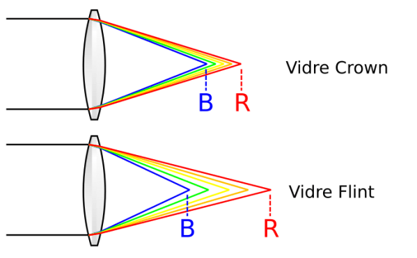 Si el valor de V és més gran de 50 es diu que el material és poc dispersiu i se’l denomina material crown, i si V és més petit de 50 el material és molt dispersiu i se’l denomina flint. Per tant, per a que les lents tinguin poca aberració cromàtica s’hauran d’utilitzar materials tipus crown.