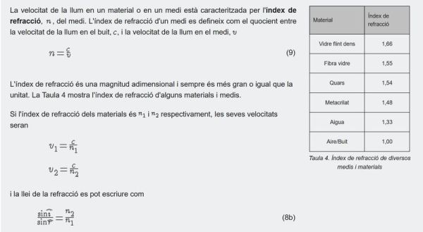 Tradicionalment hem introduït l’índex de refracció al començament de l’estudi de l’òptica geomètrica a primer de batxillerat (per exemple, Física en context, Unitat 1 – La llum), encara que amb anterioritat a l’ESO ja s’hagi estudiat el concepte de refracció i fins i tot d’index de refracció (per exemple, Llum i color, Material per l’alumnat (1/2) pag 54).