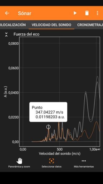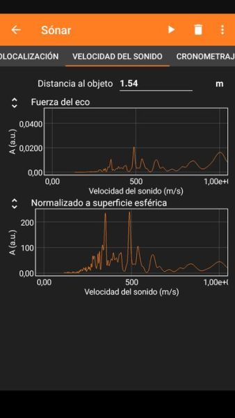 En aquesta ocasió us proposo la utilització de l’apartat Sonar de l’app PhyPhox que directament ja indica la velocitat del so que rebota en una paret, coneguda la distància a la que es fica el telèfon. L’app ho fa tot, no cal fer cap soroll ja que la mateixa aplicació emet el so que ha d’anar i tornar.