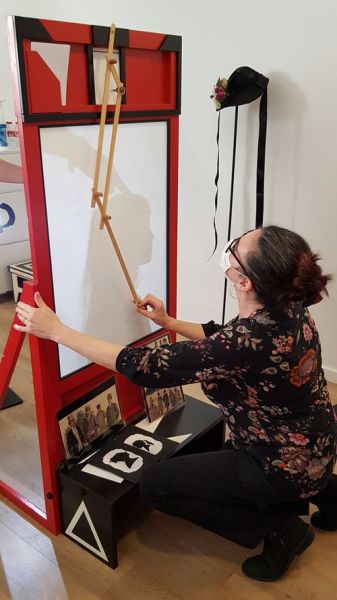 El taller que ens van oferir consistia en la realització d’un retrat a cadascuna de les persones assistents realitzat amb una mescla de la tècnica de la silueta i la del fisionotraç. Gràcies a una pantalla translúcida i un pantògraf de fusta l’artista aconseguia traslladar la silueta de la pantalla a una làmina de cartolina ubicada en la part superior de l’aparell, com es veu a la fotografia.