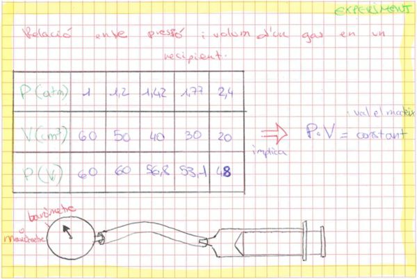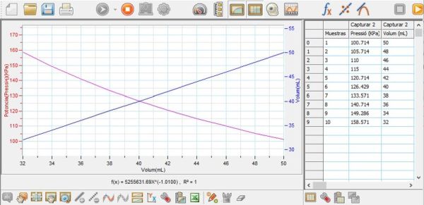 Els hi deixava una xeringa de 60 mL, un manòmetre i un tub de goma per enganxar un i l’altra, i els hi demanava emplenar una taula de valors com la de sota, per a continuació fer el corresponent anàlisi gràfic i analític de les dades.