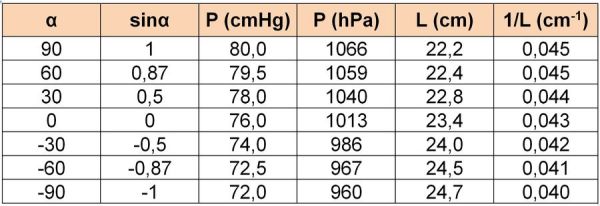És a dir, la pressió no depèn més que de l’angle, que es pot mesurar amb un transportador, i el volum de l’aire tancat no depèn més que de la seva longitud en el tub. En fer les mesures es poden obtenir unes dades com les següents: