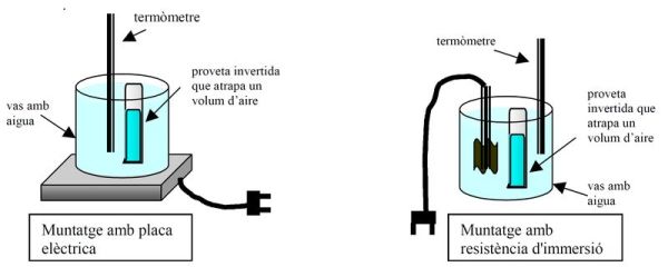 S’escalfa aigua i es vesa en una proveta gran (d’un litre, per exemple). S’introdueix en la proveta un termòmetre i un tub de Mariotte simple i es van anotant els valors de les temperatures que aporta el termòmetre i de les altures de la columna d’aire tancat en el tub que es mesuren amb una regla mil·limetrada adossada a la proveta.