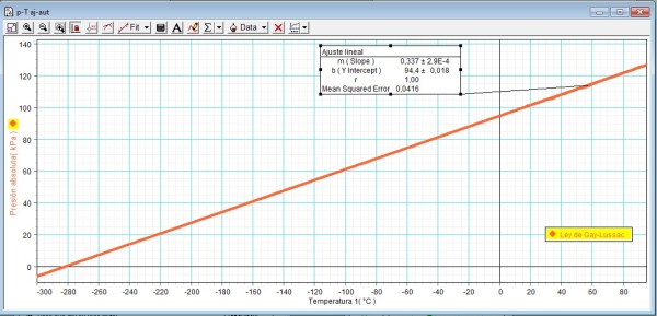 A sota hi és una gràfica en la que es veu que, malgrat les oscil·lacions de les dades, és evident la relació entre la pressió i la temperatura i en la que s’obté un valor del zero absolut de -275,3 ºC, que no està gens malament.
