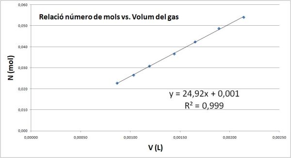 I si es grafica el número de mols en relació al volum que obtenen apareix una relació directament proporcional clavada.
