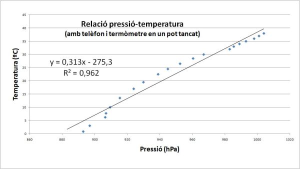 Si no teniu ni tensiòmetre ni sonda de pressió segur que en teniu un telèfon mòbil. El següent disseny experimental per aconseguir dades que relacionin la pressió amb la temperatura de l’aire tancat en un recipient necessita un pot de vidre gran amb la boca ampla que permeti introduir el telèfon, el mòbil i un termòmetre que hi entri al pot.