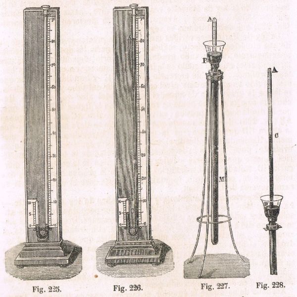 El tub de les figures 227 i 228 també és de Mariotte i també amb mercuri. Aquí, en pujar el tub graduat que tanca un volum d’aire, disminueix la pressió al elevar-se la columna de mercuri, de manera que augmenta el volum d’aire.