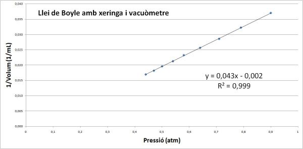 Fent mesures amb el muntatge de la foto s’obtenen unes dades que concorden prou bé amb la Llei de Boyle, com es mostra en el gràfic. Al volum que marca la xeringa l’he afegit 3 mL corresponents al volum d’aire dins el tub de plàstic que connecta la xeringa i el vacuòmetre.