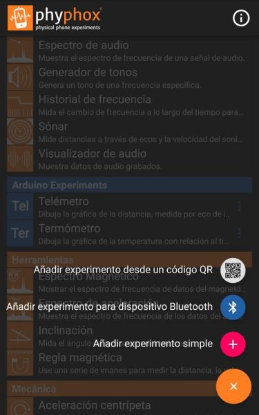 Per obtenir les dades en el telèfon s’ha de tenir connectat el bluetooth i la ubicació, s’ha d’obrir l’aplicació Phyphox i s’ha de pitjar en el botó més. Apareixerà una pantalla com la de sota a l’esquerra on es pot escollir entre afegir un experiment amb codi QR, afegir-lo per bluetooth o iniciar un experiment simple que es genera “simplement” escollint el sensor del telèfon que es vol utilitzar. Si s’opta per experiment per bluetooth apareix una pantalla en la que s’ha de seleccionar el dispositiu Termometro, que és el nom que s’ha assignat en el codi del projecte. En aquest moment l’app pregunta si es vol guardar l’experiment en la llista de la pantalla d’inici per altres vegades.