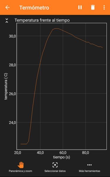 I ja es pot començar a agafar dades de temperatura que aniran apareixen en el gràfic. El gràfic es pot ampliar i consultar els valors sobre ell mateix. En aturar la presa de dades es poden guardar o enviar per tractar-les posteriorment i/o guardar aquest experiment concret en la pantalla inicial de l’aplicació.