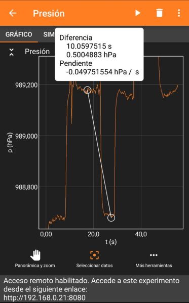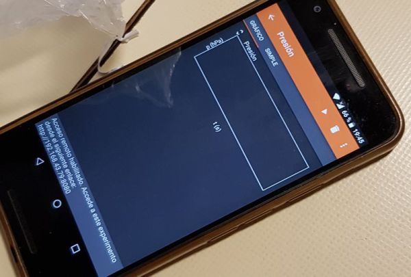 Per a mesurar la pressió dins la bossa quan es fa amb el telèfon, prèviament a introduir el mòbil a la bossa i tancar-la, s’ha d’obrir l’aplicació Phyphox, i dins aquesta el sensor pressió. A més, per a poder seguir l’aplicació en remot s’han de pitjar els tres puntetes de dalt a la dreta i allí marcar permetre accés remot. Apareixerà una pantalla com la de sota que indica la direcció web que s’ha d’introduir en un navegador d’un ordinador o un altre telèfon o tauleta.