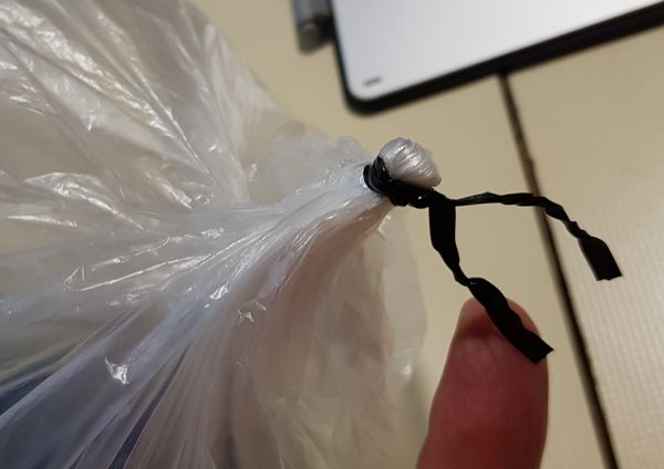També es necessita una bossa per tancar-hi dins el telèfon o l’Arduino. Una bossa gran de congelats amb tanca hermètica està molt bé, però també serveix una bossa gradeta de les que s’utilitzen al súper per ficar-hi la fruita, que es tanca bé amb l’ajut d’un filferro d’aquells folrats de plàstic. El que s’ha de comprovar és que en tancar la bossa no hi tingui forats i surti l’aire.