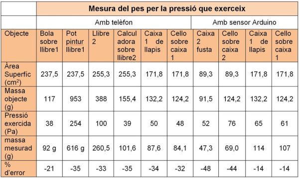 Com es pot veure, el tant per cent d’error és molt homogeni quan s’utilitza el telèfon per a fer les mesures. Sempre surten valors del pes per sota del que realment és i gairebé sempre entre un 30 i un 35 % menys. En el cas del sensor connectat a Arduino es confirma que si la base sobre la que es col·loquen els objectes és petita els resultats són molt dolents, però si la superfície és prou gran com per a cobrir quasi tota la bossa el resultat ve a ser de l’ordre del pes real (un 14 % per sota), i molt millor que en el mateix cas mesurant amb el telèfon (32 % per sota).