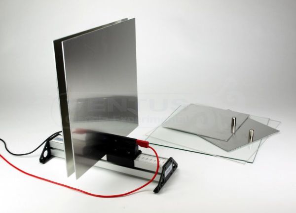 Es necessita un condensador de làmines planes i paral·leles regulable en distància i d’una superfície relativament gran (més de 200 cm2) per tal que la seva capacitat tingui un valor prou gran que permeti la seva mesura. El dispositiu es pot comprar en cases de material didàctic a un preu de 270 €, com aquest de la casa Ventus, però també es pot construir un amb dues planxes de metall (alumini, acer, etc) d’uns 20×20 cm i que siguin ben planes.
