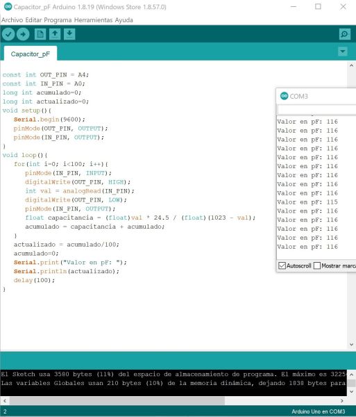 Es connecta l’Arduino a un ordinador a través del cable USB i Windows 10 reconeix automàticament el dispositiu i l’assigna un port sèrie de comunicació. A continuació bé s’obre l’IDE d’Arduino i s’enganxa el codi de sota o es baixa l’arxiu Capacitor_pF.ino i es llança.