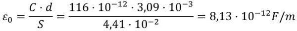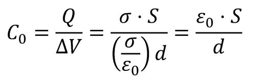 On C0 és la capacitat del condensador amb aire entre les seves plaques, S és la superfície de cada placa, d és la distancia entre plaques i ε0 és la permitivitat de l’aire. Es considera que la càrrega elèctrica es distribueix homogèniament per la superfície dels conductors de manera que σ0 és la densitat de càrrega elèctrica calculada com el quocient entre la càrrega total Q i la superfície S en la que es distribueix. ΔV és la diferència de potencial elèctric entre les plaques del condensador.