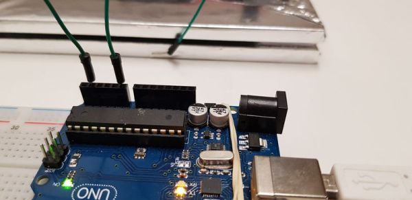 Com es veu en la fotografia de sota, el que s’ha de fer es connectar una de les plaques del condensador al pin A0 de l’Arduino i l’altra placa al pin A4. És indiferent quin a quin ja que el condensador pla és simètric i no té polaritat com els electrolítics.