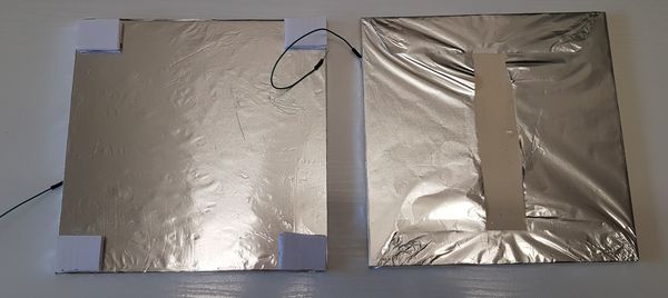 Una alternativa encara més assequible és la de fabricar el condensador amb dues planxes de fusta o plàstic (sempre ben planes) a les que enganxar amb cola paper d’alumini. És el que expliquen en Askix i és el que jo he fet per aquest experiment.