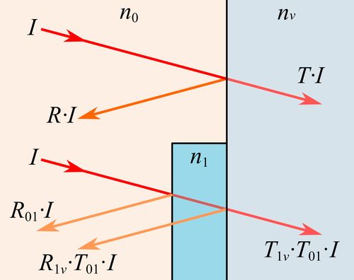 Si es fa el càlcul per a l’exemple del vidre (nS ≈ 1,5) i l’aire (n0 ≈ 1,0) aquest índex de refracció òptim surt n1 ≈ 1,23, i ara amb aquests nous valors d’índex de reflexió resulta que la pèrdua per reflexió en cada interfície és d’un 1,0% aproximadament (en total del 2,0%) i que la transmissió total T1v T01 és del 98%. Per tant, un recobriment intermedi entre l’aire i el vidre pot reduir a la meitat la pèrdua de llum per reflexió.