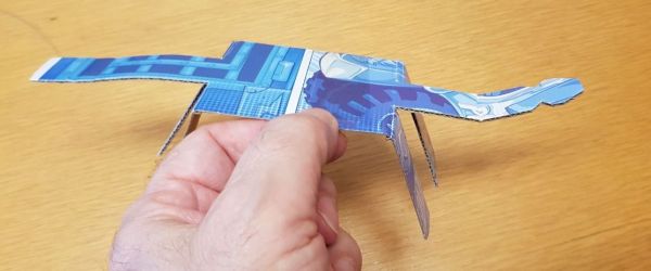 - ha de ser un fregament considerable entre les potes i la rampa inclinada. Si la rampa no frega prou amb el cartró de les potes, el dinosaure llisca i no camina (s’han de provar diferents superfícies), i