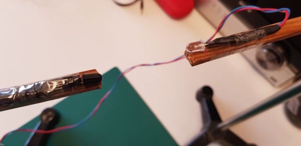 En la foto de dalt es fa passar la tanca per una barrera de fusta en la que els sensors estan encastats en uns forats fets amb un trepant, i així queden fixos.