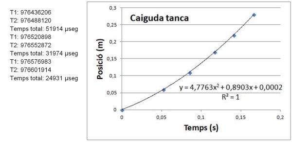 L’equació mostra una acceleració de caiguda de a = 2×4,776 = 9,55 m/s2, el que és un valor molt acceptable per a l’acceleració de la gravetat.