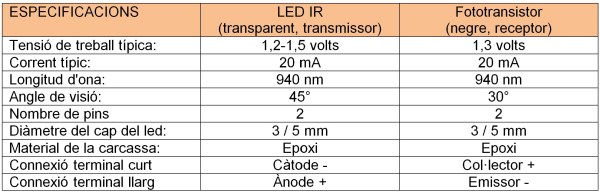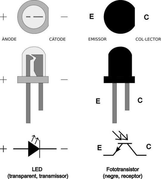 En tot cas nosaltres muntarem les fotoportes utilitzant prioritàriament la parella composada per un led transparent (emissor) i un fototransistor (receptor) de dues potes només (col·lector i emissor) de color negre que treballen tots dos a l’infraroig (940 nm). L’escollir preferentment l’IR és perquè així s’eviten interferències de les llums visibles de l’ambient.