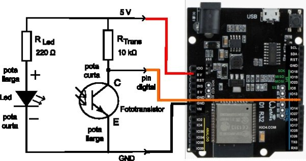 Després s’han d’unir els extrems lliures de les dues resistències i connectar-les a les sortides de 5 V de la placa Arduino o ESP32. També s’han d’unir la pota curta del led i la llarga del fototransistor i connectar-les a terra (GND). Per últim, per indicar al microprocessador si el fototransistor està il·luminat, o no, s’ha de connectar la unió entre el fototransistor i la seva resistència al pin que s’indiqui en el codi de cada projecte; en el cas de la fotografia de sota al pin digital 26 del ESP32 (Wemos D1 R32).