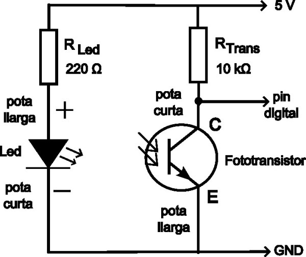 Els pins a que es connecta el col·lector del fototransistor són digitals ja que el que aquí ens interessa no és mesurar el voltatge d’aquesta pota per saber si el transistor està més o menys il·luminat, sinó si al col·lector hi ha voltatge(HIGH), o no (LOW).