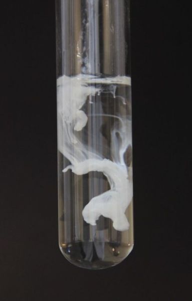- Afegiu ara a cada mostra, gota a gota, solució de nitrat de plata, AgNO3 , i aneu comptant-les. Primer apareix un precipitat blanc de clorur de plata, AgCl. Continueu posant-hi gotes de nitrat de plata i remenant alhora fins que aparegui un color vermellós permanent. Aquest color ens indica que hem d’aturar l’operació.