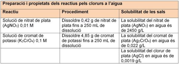 - Segons els coneixements de Química de l’alumnat poden explicar en què es basa el procediment emprat per conèixer la concentració de clorurs en l’aigua i per què precipita primer el clorur de plata i desprès el cromat de plata.
