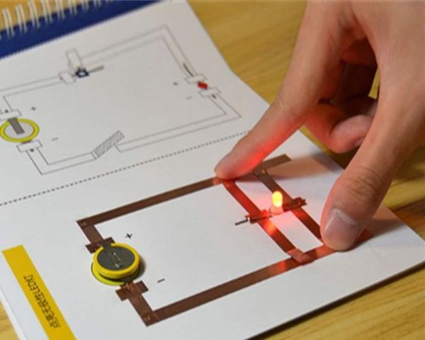 Si es volen fer circuits sobre paper amb canalla una altra possibilitat més econòmica és utilitzar tires de cinta de coure autoadhesiva, per exemple aquesta de 5 mm d’ample i 50 m de llarg per 8 €. També hi ha joguines per a que els nens i nenes facin circuits d’aquesta manera.