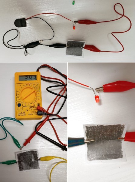 Si el grafit condueix tal qual o barrejat amb argila en la mina dels llapis, també haurà de conduir si es deposita sobre un paper a base de rallar-lo amb un llapis. A sota teniu tres fotografies en les que es veu un quadradet de paper, ben negre de pintar-lo amb llapis, connectat en un cas en sèrie a una pila botó de 3 V i a un led vermell que llueix, en una segona foto hi és el detall del led, i en la tercera es mesura la resistència del grafit sobre paper amb un polímetre (34,3 kΩ).