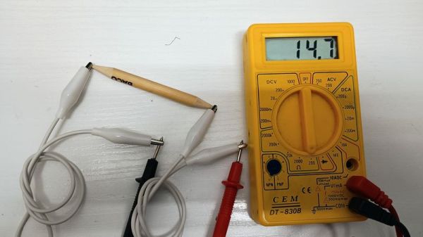 A mi m’agrada més aquesta última forma sobre tot si el polímetre és analògic perquè m’encanta veure com es mou l’agulla (o no). En la foto de sota el bocinet de llapis té una resistència de 14,7 Ω.