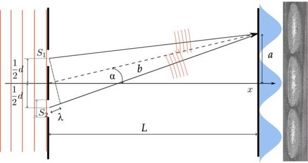 Segons el principi de Huygens, quan l’ona de llum arriba a les dues escletxes, cada ranura actua com una nova font d’ones secundàries coherents. Aquestes dues noves ones es propaguen des de les ranures cap a la pantalla. A la pantalla, les ones provinents de les dues escletxes se superposen. Aquest fenomen de superposició es diu interferència.