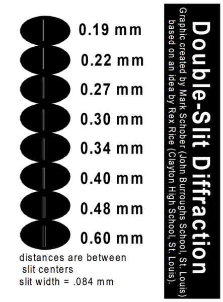 2.- Dobles escletxes de diversa mida i de distància controlada es poden obtenir també dibuixant-les amb un programa de dibuix com Inkscape i imprimint-les en blanc i negre en un acetat transparent adequat al tipus d’impressora o fotocopiadora que s’utilitzi. Les escletxes del dibuix de la vora les podeu baixar en aquest PDF i imprimir-les en qualitat alta (per tal que el negre sigui negre) al 100% d’escala (grandària real).
