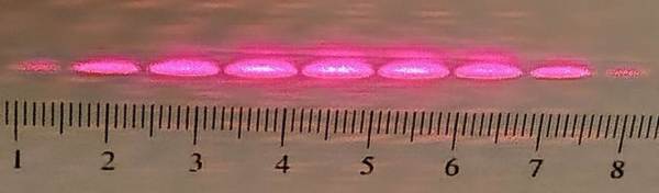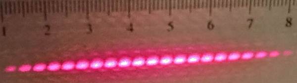 Espectre obtingut a partir d’un llum làser de 654 nm, una doble escletxa de separació 200 µm i una pantalla situada a 107 cm. Per a mesurar distancies entre zones és convenient agafar quatre o cinc a banda i banda del punt central i dividir el valor obtingut per 8 o 10.